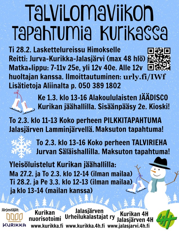 Talvilomaviikolla tapahtuu monenlaista. Kurikan kaupungin nuorisotoimi järjestää yhdessä Kurikan 4H:n, Jalasjärven 4H:n ja Jalasjärven Urheilukalastajien kanssa monipuolisen toimintaviikon kokoperheelle!