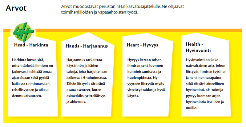 Kasvatusajattelumme perustan muodostava neljä H-kirjainta ja Tekemällä oppimisen käytännönläheinen toimintamenetelmä. Näistä lähtökohdista järjestö toteuttaa yrittäjyys- ja kansalaiskasvatusta. Neljän H:n perustana ovat sanat Head, Hands, Heart, Health, suomeksi Harkinta, Harjaannus, Hyvyys ja Hyvinvointi.